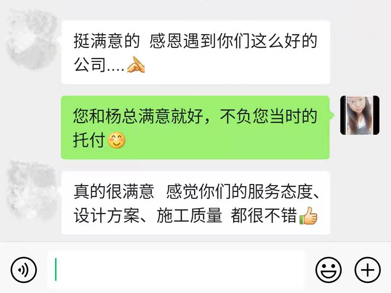 真的很滿意,很感恩遇到這么好的公司,服務(wù)態(tài)度、施工質(zhì)量、設(shè)計(jì)方案都很不錯(cuò)。